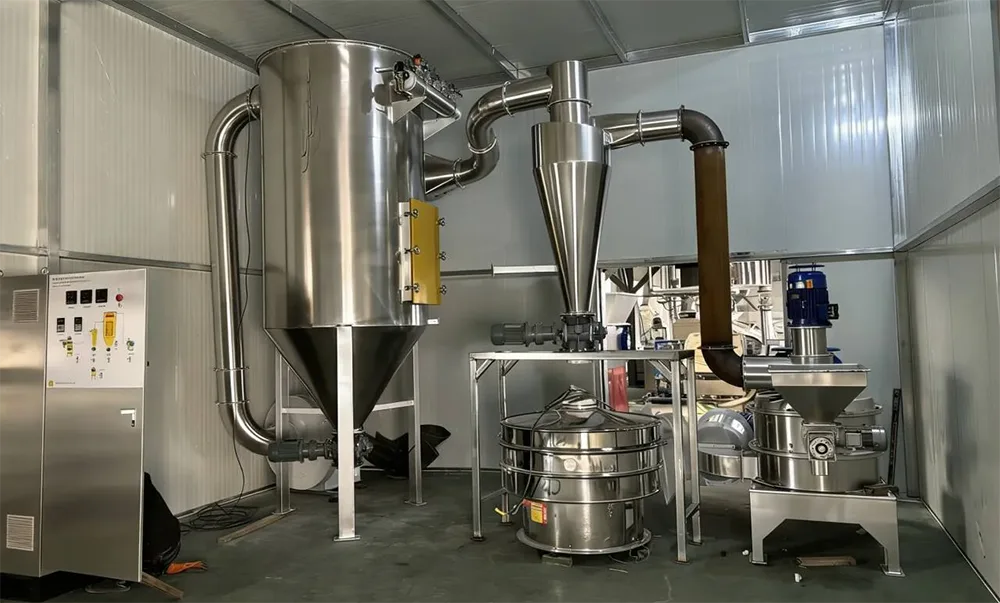 2. Noyau de concassage : équipés de lames de concassage rotatives à grande vitesse et d'un mécanisme de classement centrifuge de précision, les lames sont affinées à l'aide d'une technologie de trempe et de résistance à l'usure, avec une dureté élevée et une forte résistance à l'usure. Ils peuvent rapidement écraser les parois cellulaires des fruits et légumes, et la finesse de broyage peut être ajustée de manière flexible en fonction des besoins réels, adaptée à différents scénarios ; Le mécanisme de classement peut filtrer avec précision la taille des particules de poudre, garantissant que le produit fini est uniforme et délicat, sans aucune impureté de particules grossières.