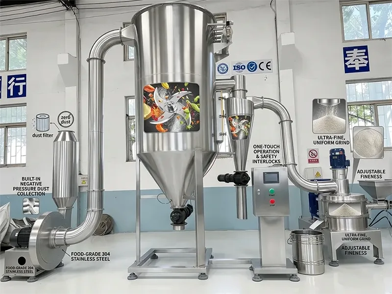 4. Sûr et respectueux de l'environnement, conforme aux normes : l'ensemble de la machine adopte une conception entièrement scellée, sans fuite de poussière, rendant l'environnement d'exploitation plus propre et répondant strictement aux exigences environnementales ; La combinaison de matériaux de qualité alimentaire et de conception standard GMP garantit que la poudre de fruits et légumes broyés est inodore et non polluante, et peut être directement utilisée dans des scénarios haut de gamme tels que la transformation des aliments et la production de produits de santé ; Le bruit de fonctionnement de l'équipement est contrôlé dans une plage raisonnable et ne causera pas d'interférence avec l'environnement.