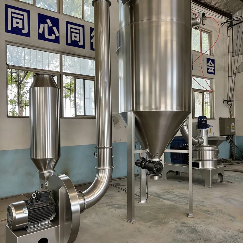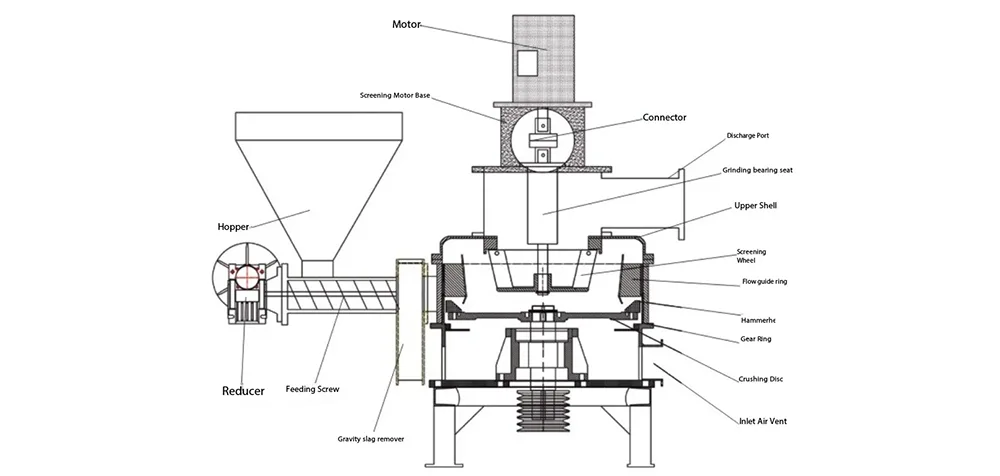 Le flux de traitement spécifique est simple : tout d'abord, introduisez la matière première en poudre grossière dont la taille des particules ne dépasse pas 10 mm dans la trémie d'alimentation, puis transportez-la vers la chambre de concassage à une vitesse constante via un alimentateur à fréquence variable ; Le disque de broyage dans la chambre de broyage tourne à grande vitesse, entraînant le marteau de broyage et le rouleau de broyage à fonctionner de manière synchrone à grande vitesse, générant une forte force centrifuge et jetant la matière première en poudre grossière dans la paroi interne de la chambre de broyage ; Sous l'action de la force centrifuge, les matières premières subissent de graves collisions, cisaillements et frottements avec des plaques de revêtement résistantes à l'usure, des marteaux de concassage et des rouleaux de concassage, complétant ainsi le concassage préliminaire ; Après le concassage initial, le matériau sera amené dans la chambre de classification par le flux d'air à pression négative généré par le ventilateur à tirage induit. La roue de classification dans la chambre de classification tourne à grande vitesse pour classer avec précision en fonction de la taille des particules. La poudre ultra-fine qui répond aux exigences (la taille des particules peut être ajustée selon les besoins) sera amenée dans le collecteur par le flux d'air pour compléter la collecte ; La poudre grossière qui ne répond pas aux exigences de granulométrie sera interceptée par la roue de classement et renvoyée à la chambre de concassage pour un concassage secondaire jusqu'à ce qu'elle atteigne la norme de granulométrie spécifiée, garantissant ainsi l'uniformité de la poudre finie.