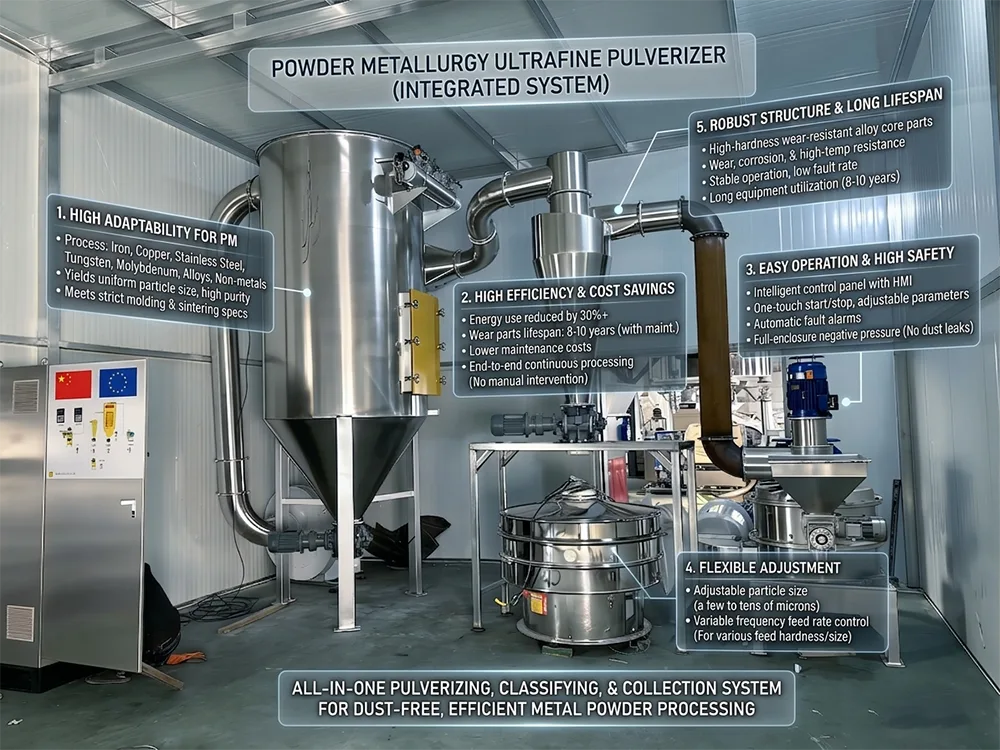 Le pulvérisateur ultrafin pour la métallurgie des poudres est un équipement spécialisé développé spécifiquement pour l'industrie de la métallurgie des poudres. Il est principalement utilisé pour le traitement ultrafin des poudres métalliques, des poudres d'alliage et de diverses matières premières en poudre non métalliques, et peut parfaitement s'adapter aux exigences de traitement des matières premières de l'ensemble du processus de production de la métallurgie des poudres. Comparé aux équipements de concassage ordinaires, la caractéristique la plus importante du pulvérisateur ultrafin de métallurgie des poudres est son adhésion aux normes strictes de l'industrie de la métallurgie des poudres, qui peut contrôler avec précision la taille des particules de la poudre, assurer une distribution uniforme des particules et éviter complètement la pollution secondaire, garantissant la haute pureté de la poudre finie et répondant pleinement aux exigences fondamentales des processus de formage, de frittage et autres ultérieurs.