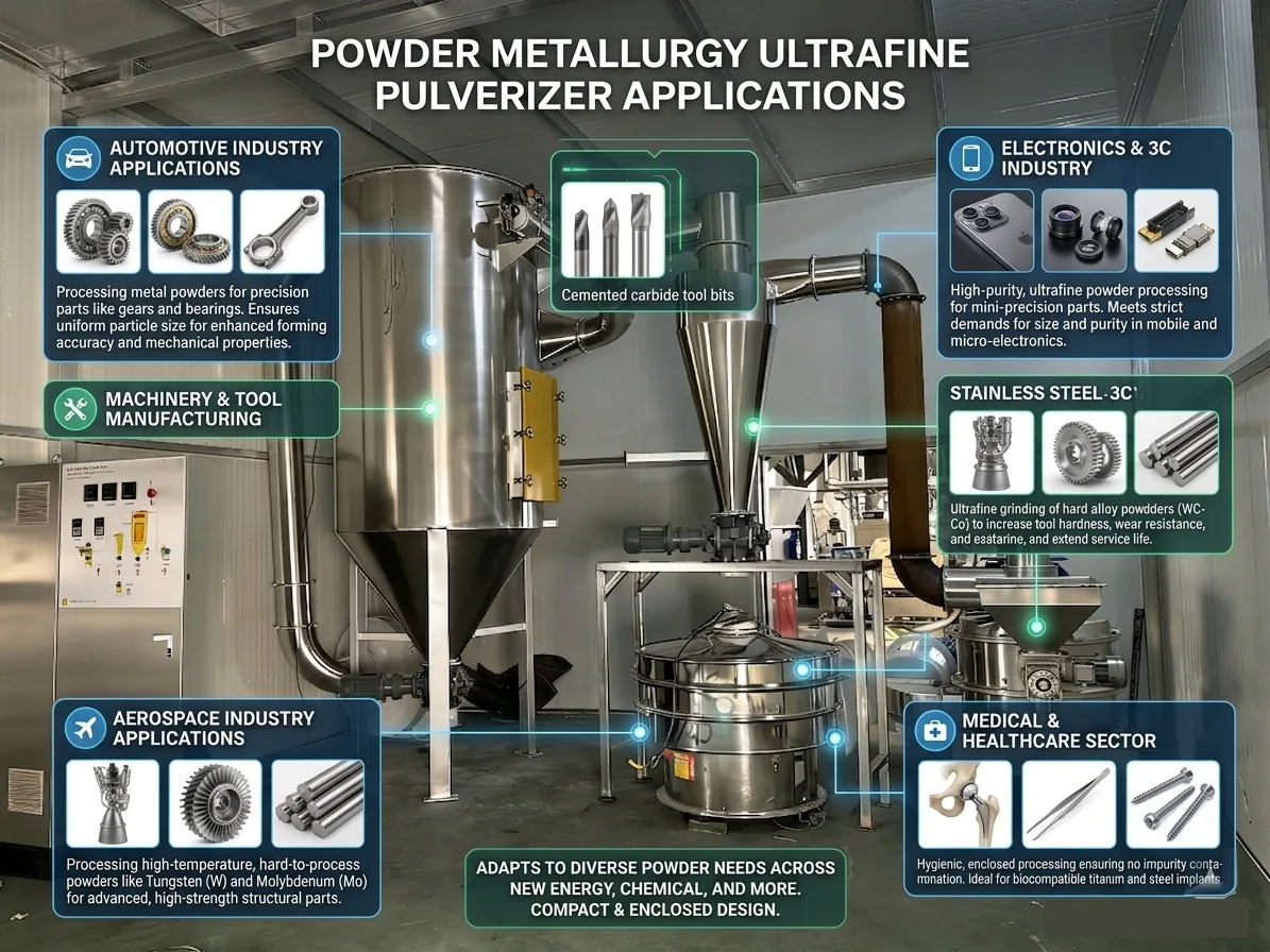 Le pulvérisateur ultrafin de métallurgie des poudres est principalement utilisé pour le traitement ultrafin des matières premières dans l'ensemble de l'industrie de la métallurgie des poudres et peut s'adapter au traitement de concassage de diverses poudres métalliques, alliées et non métalliques. Il est largement utilisé dans de nombreux domaines tels que l’automobile, les machines, l’électronique, l’aérospatiale, le médical et la fabrication d’outils. Les scénarios d'application spécifiques sont les suivants :